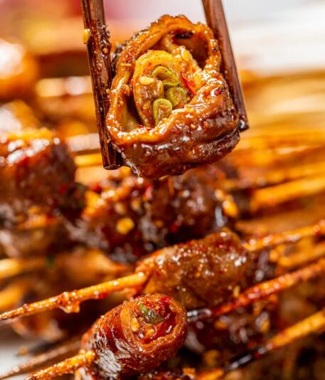 内里的大葱清甜又辛辣,肥肠被烤料辣油包裹,整个一起入口,层层递进的辣度就足够喝两杯了!